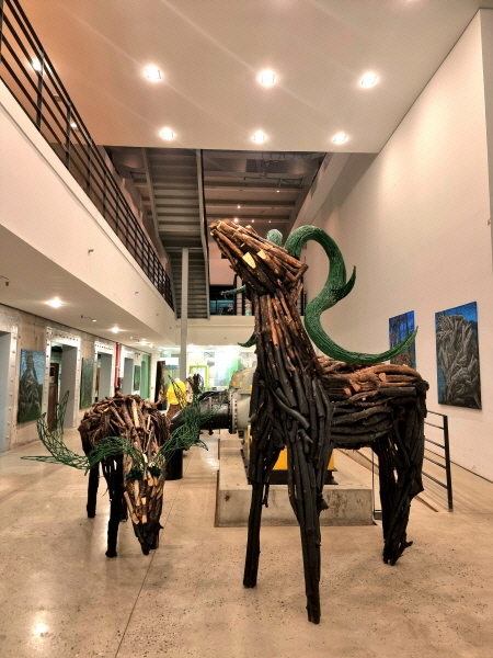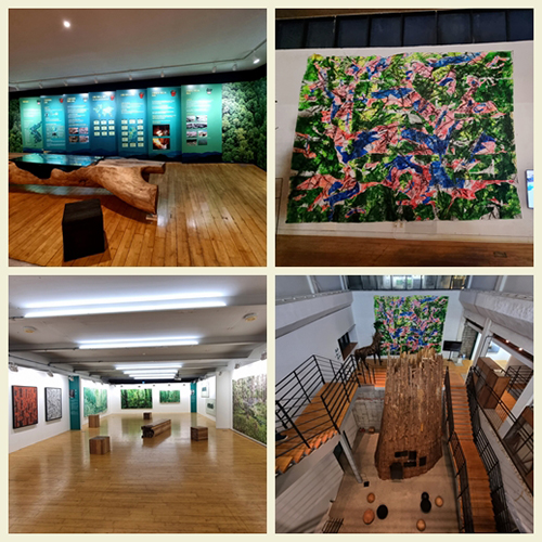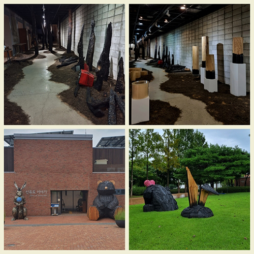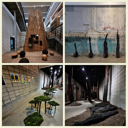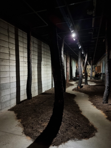 <산불피해 지역 동해 숲 재현> 처음 산불 피해지를 찾아갔을 때의 첫 느낌은 암울하고 무섭고 안타까웠다. 불길에 타버려 나무들이 쓰러져 있는 모습이 마치 전쟁터에서 싸늘한 주검으로 누워있는 사람의 모습처럼 느껴졌다. 자연재해나 인재로 인한 산불로 수십 년 동안 가꿔온 산이 잿더미로 뒤덮인 모습은 충격 그 자체였다. 그날 함께 산불 현장에 있는 작가들 모두 자연에게 부끄럽고 반성하게 되었다. 우리는 전시장에 산불 현장을 재현해 사람들에게 우리가 그곳에서 느낀 감정을 전달하고 싶어 재현하였다.