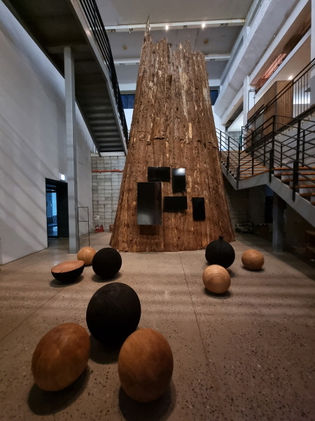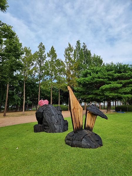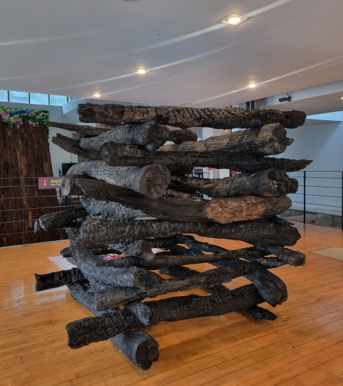 <적재> 2023년 4월 강원도 강릉시에 강풍으로 소나무가 부러지면서 전신주를 건드려 불씨가 산불로 확산하였다. 그 피해 지역을 직접 방문해 심하게 불에 타 쓰러져 있는 나무 기둥들을 옮겨 그 모습 그대로 쌓아 올렸다. 살아 있는 나무에서 하루아침에 죽은 나무 '재' 가 되어 버렸다. 이러한 오브제 작품을 통해 다시 한번 더 산불에 대한 경각심을 가져 주길 바란다.