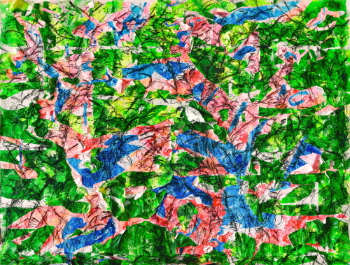 배달래 작가노트 ‘화염의 연극’이라는 제목의 의미는 기후변화에 따른 여러 위험 중 화재로 인한 자연의 무차별한 파괴와 인류와의 관계를 나타내고 있다. 화재가 일어나는 공간을 연극의 무대로 비유하여 여러 겹의 한지위에 페인팅 후 레이어드 시킨 화면을 찢어내는 과정은 자연에 가하는 인류의 무차별한 개발로 훼손된 자연의 아픔과 고통을 표현하였다. 결국에는 자연의 회복과 복원만이 인류의 희망임을 나타내는 작품이다.