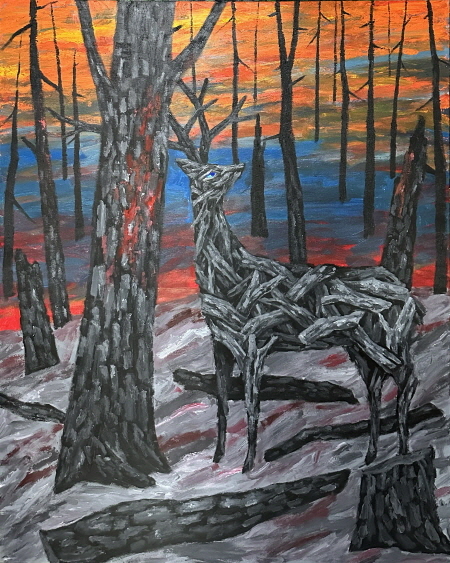 <숲의 정령> '인간의 욕심으로 훼손되고 망가진 숲' 화재로 인해 불에 타고 버려진 나뭇가지들이 다시 한번 인간들에게 기회를 준다. 나뭇가지들은 스스로 여러 모양의 형태로(사슴,곰,토끼,사람등) 숲의 정령이 되어 숲을 가꾸기 시작한다. 백승기 작가의 평면 회화에 등장하는 숲의 정령들은 이번 전시를 위해 산불 피해 지역인 홍성, 강릉, 동해 세 지역을 직접 방문해 피해목으로 만든 오브제 작품이다. 이번 작품을 통해 우리가 얼마나 자연을 귀하게 여기지 않고 쉽게 훼손하는지 반성하고 산불 예방 방지에도 관심 가져 주길 바란다.