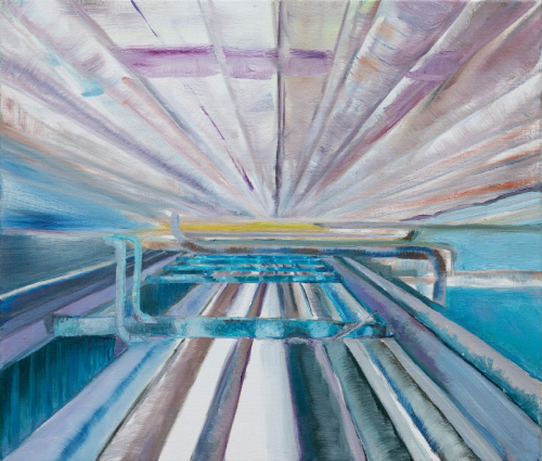 이기연 작가노트 작품 ‘접점’은 공장의 배관들을 모아놓은 파이프 랙을 그린 회화이며, 공장에 설치된 하부의 파이프 라인들이 저 멀리 지평선 끝에서 하늘의 구름과도 유사하게 묘사된 상부의 파이프라인과 연접하기를 바라는 마음을 담아서 작업하였다.