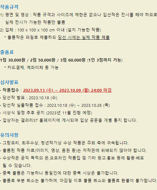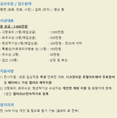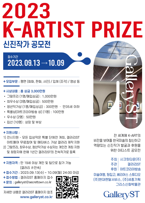 한국 조형예술의 우수함을 널리 알리고자 ‘K-ARTIST PRIZE 2023’ 아티스트 공모전을 개최합니다. 선정 작품은 국내외 각종 아트페어에 지속적으로 소개, 전시될 예정입니다. 선정 작가에게는 개인전 또는 그룹전 개최 지원과 함께 작가의 작품을 상시 전시할 수 있는 메타버스 가상갤러리를 만들어 드립니다. 재료 장르 기법 등에 구애받지 않고 K-ART의 힘을 보여줄 수 있는 창의성 담긴 다양한 작품을 기다리오니 많은 아티스트분들의 참여 바랍니다.
