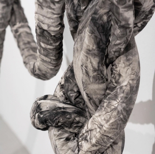 본 전시에서는 2022년까지 선보였던 <마지막 포옹>과 <우연의 무게>를 변주한 신작을 선보인다. 한 평도 안 되는 좁은 공간을 가득 메운 꽈배기 같은 천과, 천장에 위태롭게 매달린 각목을 지탱하는 직선의 천이 대조를 이루며 공간에 긴장감을 준다. 이와 더불어 작업 과정 중 나온 편린으로서 평면 작품도 함께 전시된다.