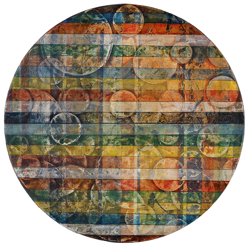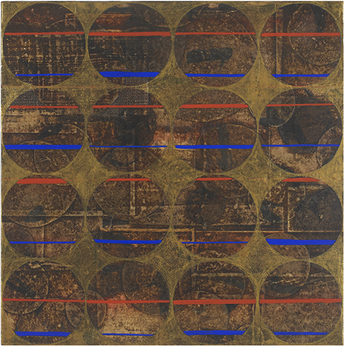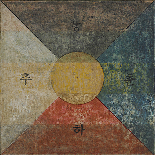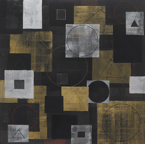 단군신화檀君神話Ⅱ - 천(ㅇ),지(ㅁ),인(△)_90x90cm_장지, 자연염료, 분채, 금분, 은분, 먹, 콩즙_2023