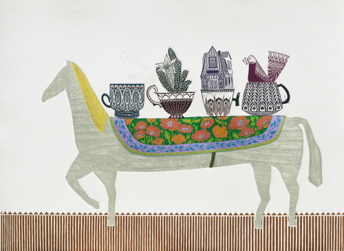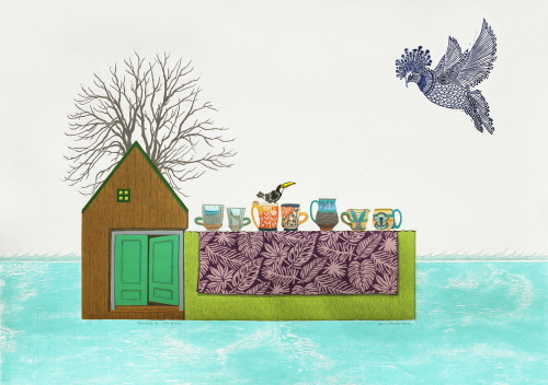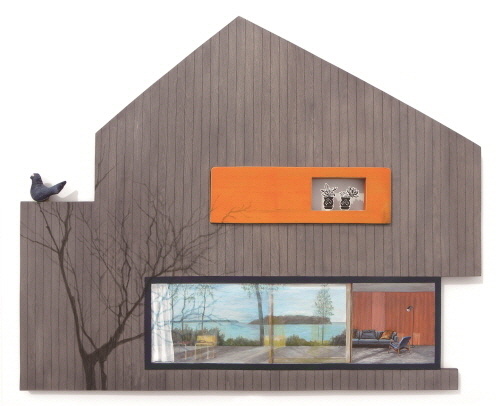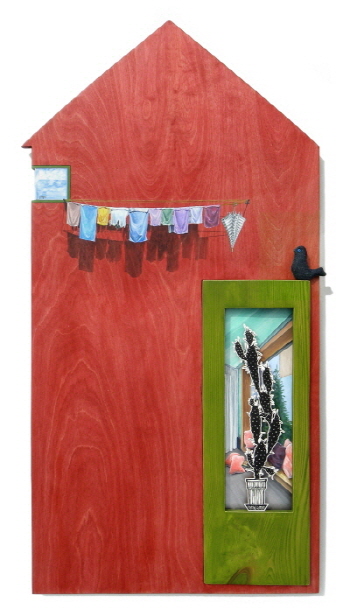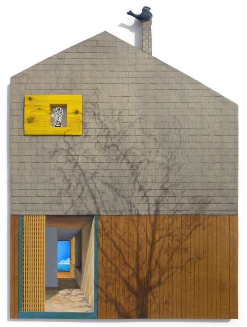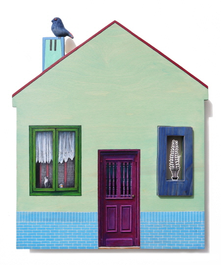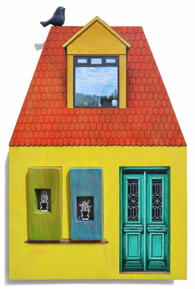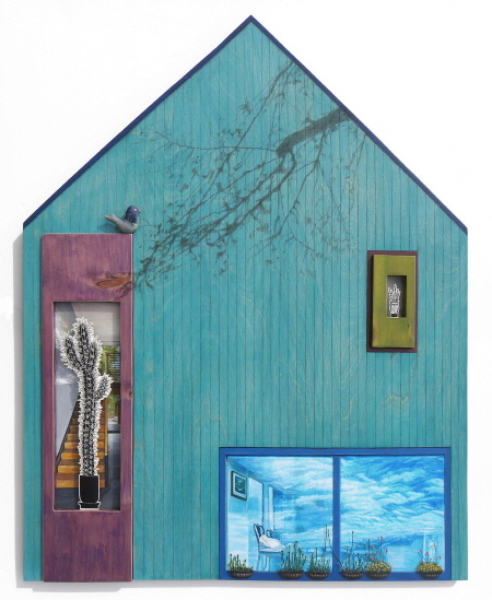 그렇게 작가는 어쩌면 소시민의 소소한 행복을, 이상을 그려놓고 있었다. 통창으로 강이 보이고, 바다가 보이고, 하늘이 보이는, 볕이 잘 드는 벽면에 나무가 그림자를 길게 드리운, 바람이 나뭇잎을 흔드는, 그리고 파랑새가 안부를 묻는, 그런 집을 그려놓고 있는 것이다. 그러므로 그 집은 어쩌면 현실을 그린 것이라기보다는 이상을 그린 것이다. 행복을 약속하는 상징들이며, 이상을 반영한 기호들로 구조화된 집을 그린 것이다. 유토피아다. 주지하다시피 유토피아는 현실에는 없는, 다만 사람들의 의식 속에만 있는 장소, 실제로는 없는 장소, 부재 하는 장소다. 그러므로 어쩌면 상실을 앓는 현대인이 꿈꾸는 장소고 집이다. 사람들은 말한다. 현대인은 온통 상실의 시대를 살고 있다고. 저마다 능력을 다투는 경쟁사회를 살고 있다고. 때로 자신의 능력 이상을 증명해 보여야 하는 피로사회를 살고 있다고. 이런 시대에 나는 불현듯 강이 보고 싶고, 바다가 보고 싶고, 하늘이 보고 싶다. 햇볕을 감촉하고 싶고, 바람을 느끼고 싶다. 나무 그림자가 서늘한, 햇볕 짱짱한 벽면에 빈 의자 하나 달랑 놓고 쉬고 싶다. 비현실적으로 길고 노란 부리를 가진 크낙새와 더불어 아프리카를 꿈꾸고 싶고, 봉황과 함께 전설만큼이나 오래된 하늘을 날고 싶다. 고양이와 함께 졸고 싶고, 빨랫줄에 널린 빨래처럼 한가롭고 싶다. 그렇게 작가가 그려놓고 있는 행복한 집은 사실은 행복하지 않은 현실을 증언하고 있다는, 이런, 역설적인 현실(아니면 사실)로 인해 더 절실하게 다가온다. 그렇게 작가는 집을 짓는다. 사실을 말하자면 집을 오리고, 그리고, 찍고, 붙이고, 기워 만든다. 자작나무 합판 위에 본을 뜬 연후에 자르고 붙여 집 형태를 만든다. 그리고 목재 전용 염료로 원하는 색감을 얻은 연후에 창문으로 보이는 풍경을, 벽면에 드리워진 그림자를 사실적으로 그려 넣는다. 그리고 두 장을 겹쳐 만든 두툼한 판화지에 목판화로 이미지를 새기는데, 판화 고유의 인출된 효과를, 상대적으로 더 뚜렷한 요철 효과를 얻을 수 있다. 그렇게 찍어서 오려낸 화분을 창틀에 고정한다. 그리고 청바지 천을 기워 그 속이 빵빵한 새를 만들고 선인장을 만든다.