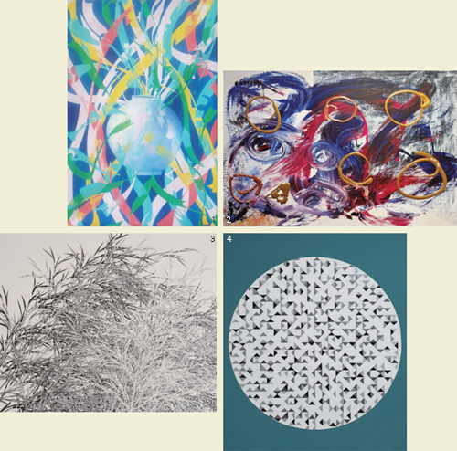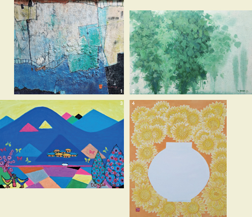 1. Ahn, Bok Soon 作_The Soul of Korea_90.9x60.6cm_Acrylic, Oil on Canvas_2015 2. Ahn, Sang Sook 作_Untitled_72.7x50.0cm_Oil on canvas_2023 3. An, Weon Tae 作_Myeongryun-dong bamboo 67_72.5x60.5cm_Sumuk on a Koreanpaper_2023 4. Bae, Ki Yeol 作_Tiffany Series-Sun_72.7x60.6cm_Acrylic on Canvas_2023