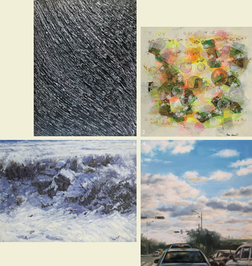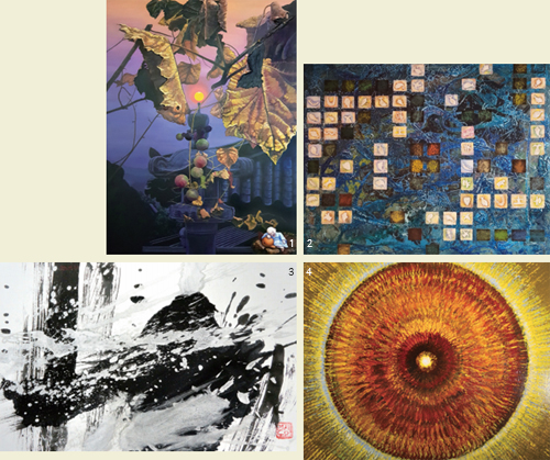 1. Lee, Yeong Hui 作_one's way home 2022-2_100x72.5cm_Oil on canvas_2022 2. Lee, Yeon Ok 作_Traveling(see the sea...)_90.9x60.6cm_Acrylic on Canvas_2023 3. Lee, Yeong Jin 作_the fountain of life_90.9x72.7cm_Mixed Media_2023 4. Lim, Geun Woo 作_cosmos-archaeological weather map_53.0x45.5cm_Acrylic on Canvas_2020