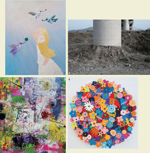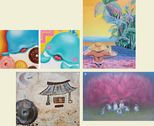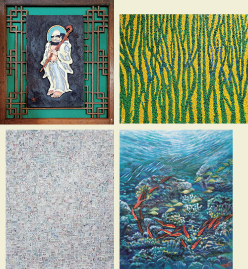 1. Jo, Gwang Ik 作_Survival_46.0x46.0cm_korean paper, cloth, pannel_2023 2. Joung, Ran Sook 作_Springtime is gon_90.9x72.7cm_Oil on Canvas_2022 3. Jung, Kee Sook 作_A feast of colorful tropical fish_65.0x50.0cm_Natural limestone, acrylic_2023 4. Jung, Chang Yeong 作_strange stone & flower_47.0x91.0cm_color on paper_2023