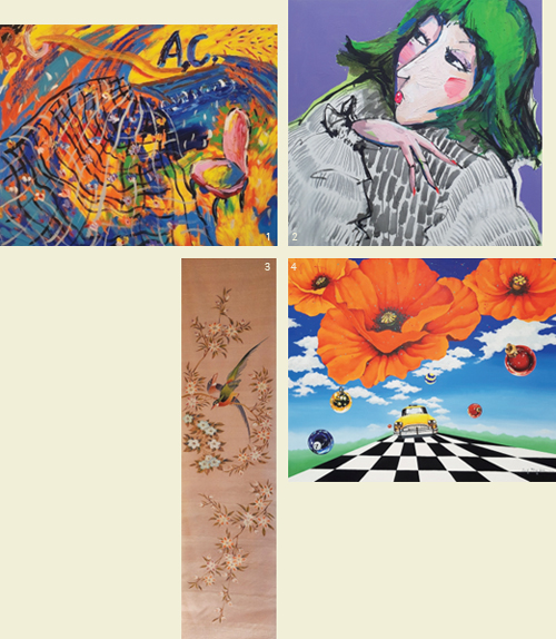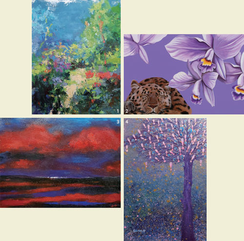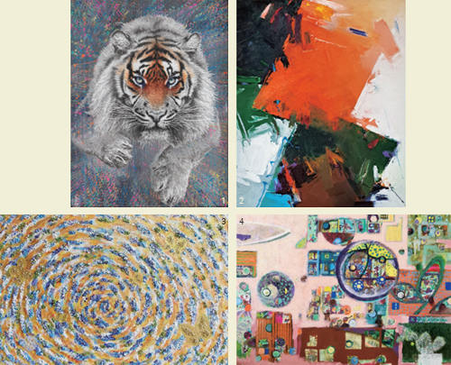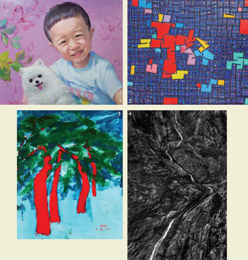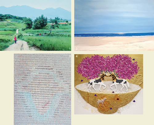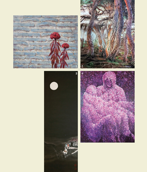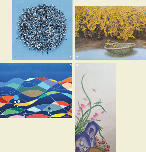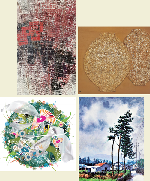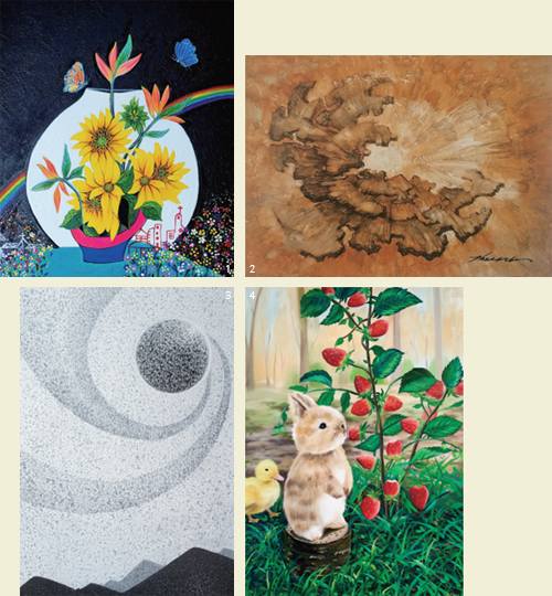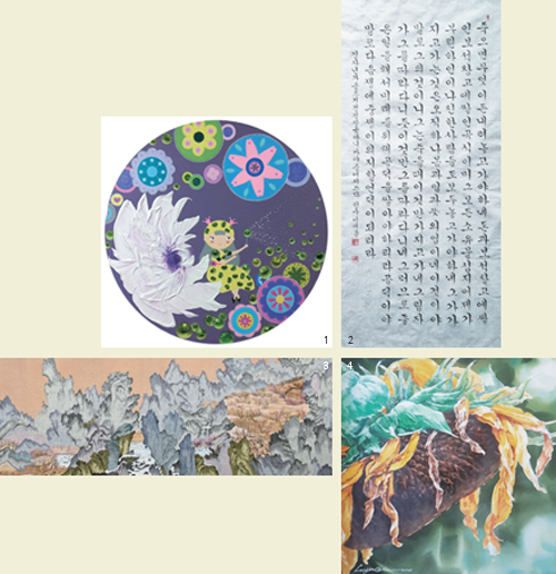 1. Lee, Ju Yeung 作_Born again_50.0x45.0cm_Fabric, Mixed Media_2022 2. Lee, Ju Ok 作_My garden_55.0x81.0cm_buncahe_2023 3. Lee, Jung Sup 作_into the Waves_72.7x60.6cm_Oil on Canvas_2022 4. Lee, Kwang Su 作_MIRACLE NATURE_80.0x60.0cm_ink on canvas, acrylic_2023