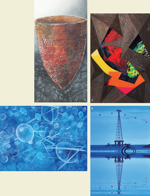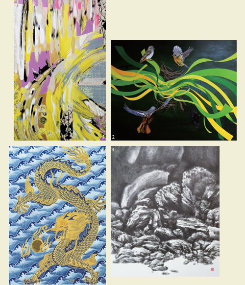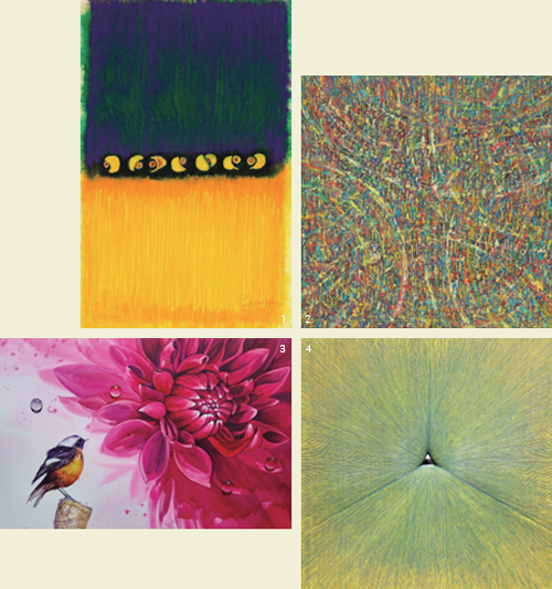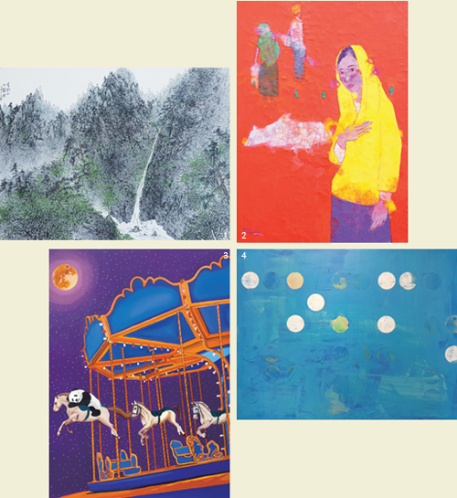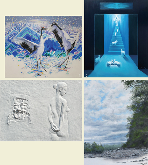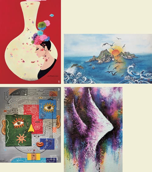 1. Na, Ok Ja 作_Flower-bearing moon_90.9x65.1cm_Acrylic on Canvas_2022 2. Nam, SooK Ja 作_Fly of Dokdo_60.0x45.5cm_coloring on paper_2023 3. Oh, Chae Wan 作_Evolution_72.7x60.6cm_Mixed Media_2023 4. Noh, Jae Whan 作_fly beyond_61.0x73.0cm_oil acrylic on canvas_2023