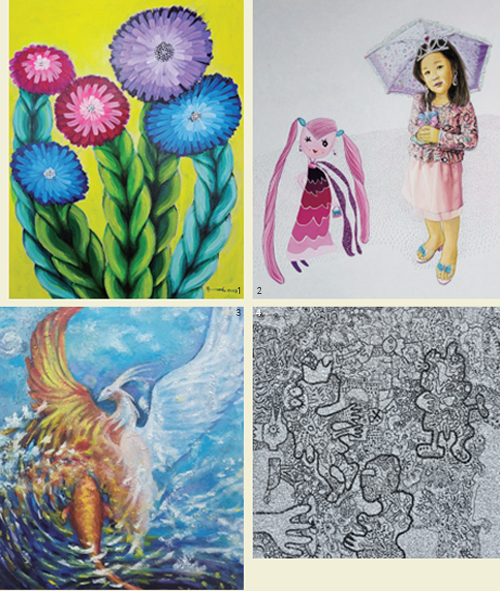 1. Kim, Jae Kyung 作_Peony painting_72.7x60.6cm_color on paper_2023 2. Kim, Jeong Hyun 作_Flower_35.0x45.0cm_Acrylic on paper_2023 3. Kim, Jong Suk 作_a picture of characters-Family Love set_35.0x74.0cmx2_coloring on paper_2023 4. Kim, Jong Hae 作_Abstract_72.7x60.6cm_Acrylic on Canvas_2023