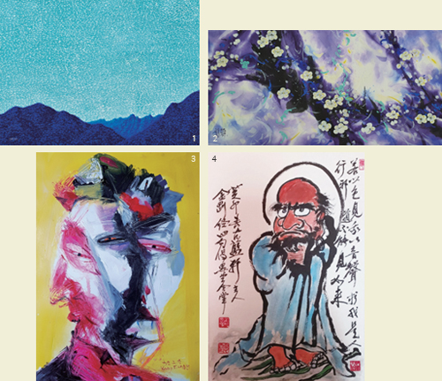 1. Jung, Young Mo 作_A Story of Home Town_72.7x53.0cm_Mixed coloring_2022 2. Kang, Geum Bok 作_Plum Blossoms in Dreams_100x50.0cm_Coloring_2023 3. Kang, Dong Seok 作_drink every day_36.0x52.0cm_Acrylic on Canvas_2023 4. Kang, Gil Hoi 作_Dharma Preceptor and Diamond Sutra_35.0x120cm_rice paper,ink and ink_2023