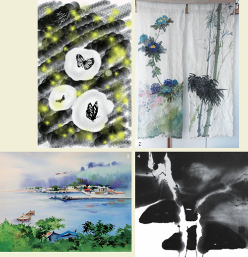 1. Kang, Jae Gu 作_Butterflies_72.7x50.0cm_Mixed Media_2023 2. Kang, Kui Yi 作_Untiled_35x135cmx2_cloth_2023 3. Kang, Keum Sook 作_The scenery I met on my trip to Geoje_53.0x41.0cm_Watercolor on Arches_2023 4. Kang, Kyu Seong 作_daily life-island_33.0x33.0cm_coloring on paper_2023
