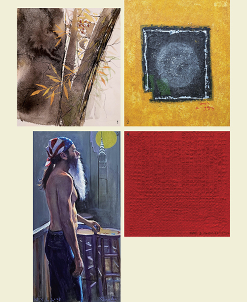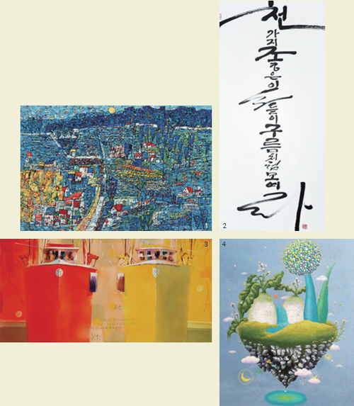 1. Yoo, Hyeon Byeong 作_Living together is art_35.0x70.0cm_color on Korean paper_2023 2. Lee, Keon Im 作_Moon, tree and apple_53.0x40.9cm_Oil on Canvas_2021 3. Yoo, Mi Gyeong 作_202302 Traces of time_45.5x37.9cm_Mixed Media_2023 4. Yoo, Young Kwae 作_Couple (man and woman)_53.3x45.5cm_Acrylic on Canvas_2023