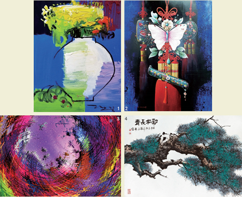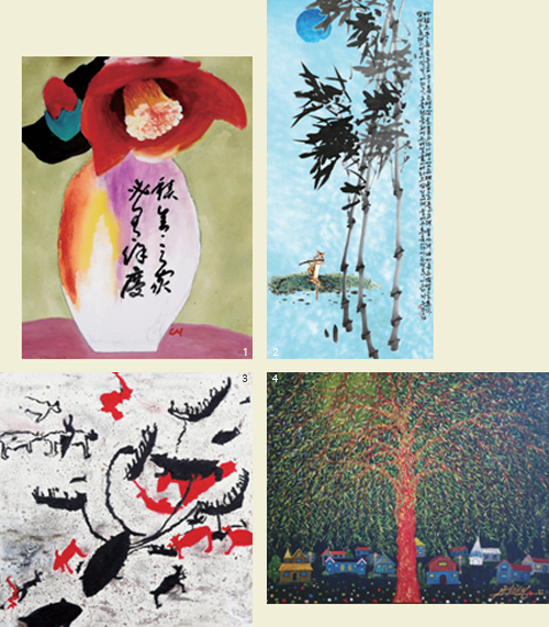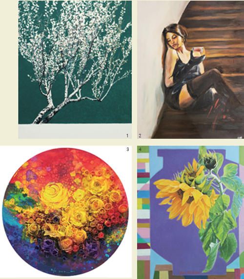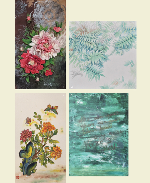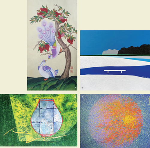 1. Lee, Hyun Suk 作_Flower and bird painting_35.0x70.0cm_.color on paper_2023 2. Lee, Hye Yeon 作_Rest_72.7x60.6cm_Acrylic on Canvas_2023 3. Lee, Ill Goo 作_The scent of a spring day_74.0x50.0cm_Korean paper and ink colors. Acrylic_2023 4. Lee, In Suk 作_Nature-Image_53.0x40.9cm_Mixed media on canvas_2023