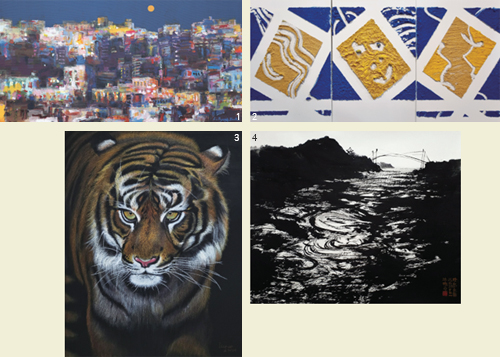 1. Lee, Byung, Kook 作_City night story_72.7x38.0cm_Acrylic on Canvas_2023 2. Lee, Bong hui 作_Rakuten_53.0x33.4cmx3pieces_Mixed Media on Canvas_2023 3. Lee, Chae Won 作_Tiger_72.7x60.6cm_oil pastel, Korean paper_2023 4. Lee, Chang Hun 作_Travel to Namdo_53.0x45.5cm_ink on Korean paper_2023
