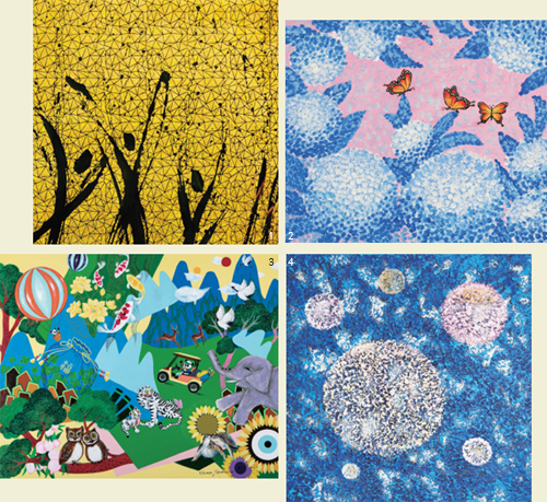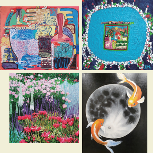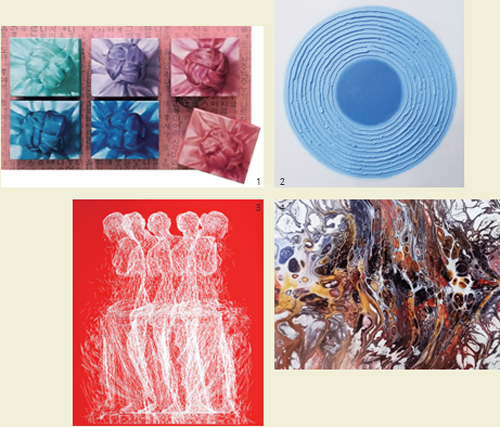 1. Lim, E Jeong 作_the water of life_90.9x72.7cm_Acrylic on Canvas_2023 2. Lim, Gyeong Suk 作_Concentric_90.9x72.7cm_acrylic. Indigo dyeing. Cloth Collage_2023 3. Lim, Jung Soon 作_Inside the Garden of Love_72.7x72.7cm_Acrylic on Canvas_2023 4. Lim, Kyung hee(Clara) 作_have fun-2330_72.7x91.0cm_Acrylic & Mixed on canvas_2023