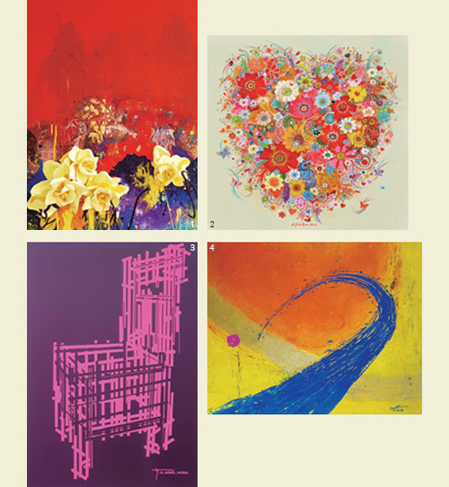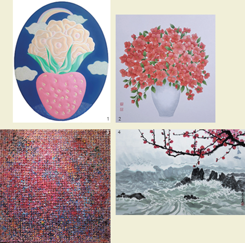 1. Won, Eun Kyung 作_Happy plus_60.6x40.9cm_Acrylic on canvas_2023 2. Won, Myeong Seon 作_Festival_72.7x60.6cm_color on paper_2023 3. Won, Jin Suk 作_Flowers smile but don't sound_80.0x80.0cm_Oil on cotton_2023 4. Woo Ha 作_flowers and waves_72.7x50.0cm_Korean paper and ink_2023