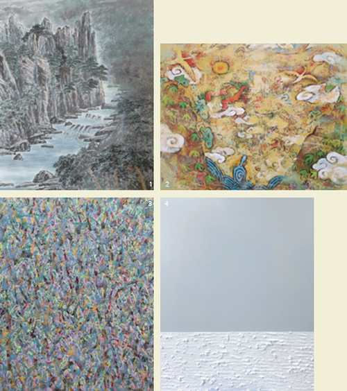 1. Choi, Hyo Hyeong (Allan) 作_Mountain temple surroundings_90.9x65.1cm_ Acrylic with mixed media on canvas_2022 2. Choi, Seol Hyang 作_Engraved longing_145x112cm_Acryic on canva_2023 3. Choi, Yong Gurn 作_Birch forest 5314_23.0x35.0cm_Ink on Paper_2023 4. Choo, Hyang ja 作_Infinite energy in the universe (peace in me)_56.0x56.0cm_Acrylic on Canvas_2023