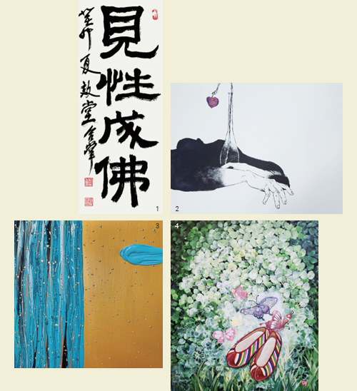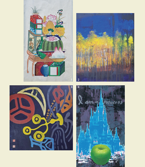 1. Park, Jung Sook 作_A trip to the past_72.7x60.6cm_Indian ink, Hwaseonji_2023 2. Park, Kyoung Soon作_fly in the sky-the ten traditional Symbols of Longevity_ 90.9x65.1cm_acrylic on wooden pannel_2023 3. Park, Na Won 作_perfume_72.7x60.6cm_Mixed media_2023 4. Park, Seon Hye 作_Field-7_90.9x72.7cm_Mixed Media on Canvas_2023