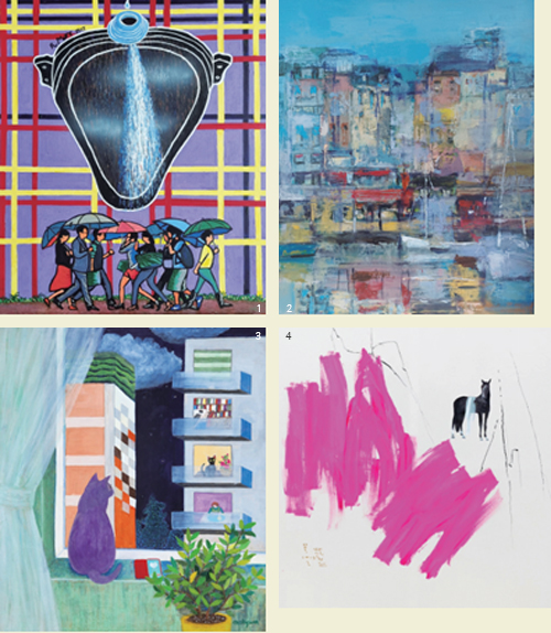 1. Han, Jeong Won 作_City in the Air 2204_72.7x50.0cm_Mixed Media on Canvas_2023 2. Han, Seok Ja 作_Moon Jar Ⅲ_65.1x53.0cm_lacquer on burlap_2023 3. Han, Seung Min 作_cheer up 08_80.3x80.3cm_Pigment Printed on Canvas_2023 4. Han, Yong Guk 作_landscape_72.7x53.0cm_Oil on Canvas_2023