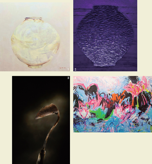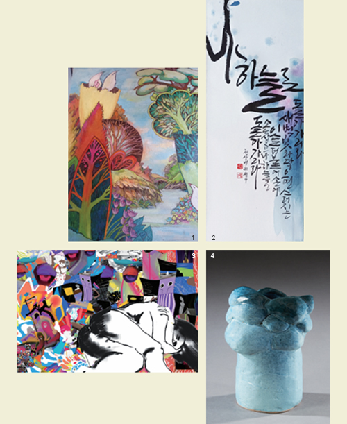 1. Ko, Hyo Sook 作_Moon jar embracing nature_25.0x25.0cm_Mixed Media_2023 2. Ko, Kyung Ae 作_Classic Scent_162.2x130.3cm_Syringe acrylic on canvas_2023 3. Kong, Da Ye 作_Smoke 2_92.0x61.0cm_Digital drawing_2023 4. Ko, Jae Bong 作_Strong, green pine tree_100x70.0cm_color on paper_2023