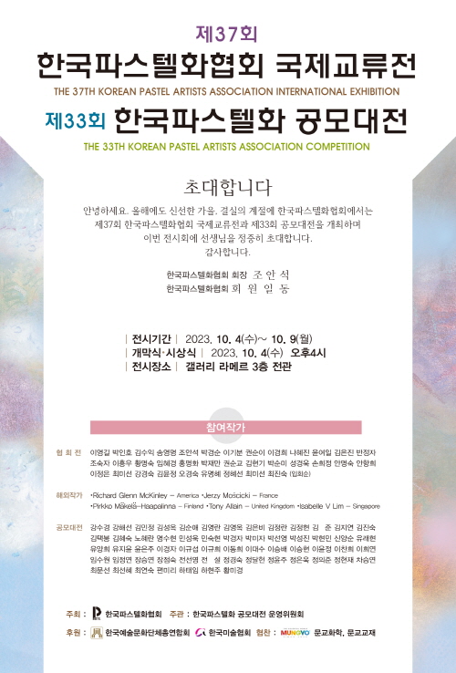 2023년도 제37회 협회전과 국제교류전 그리고 제33회 공모대전을 개최하게 되어 매우 뜻깊고 감사하게 생각합니다. 한국파스텔화협회는 1987년에 아름답고 화사한 파스텔 특유의 색감에 매료된 작가들이 모여 창립하였으며, 이후 해마다 파스텔화의 대중화와 발전을 위해 공모대전을 개최하여 왔습니다. 올해도 세심한 심사를 통해 선정된 70여 점의 공모대전 출품 작가들의 열정에 앞으로도 더욱 많은 발전이 있으시길 바라며 축하와 응원의 박수를 보냅니다. 특별히 이번 협회 회원전과 더불어 국제파스텔화협회(IAPS)회장인 미국의 리처드 맥킨리 작가를 비롯한 5명의 해외 작가작품 10점이 함께 전시하게 되어 매우 뜻깊은 전시회이기도 합니다. 실제 작품들을 멀리 미국, 프랑스, 영국, 핀란드, 싱가포르에서 보내온 해외 작가분들에게 거듭 감사의 마음을 전합니다. 이번 전시회를 위해 물심양면으로 협찬해 주신 문교화학의 김민자 회장님 그리고 문교 임직원 여러분께도 감사의 마음을 전합니다. 그리고 이번 행사가 있기까지 많은 수고를 아끼지 않은 협회 임원 여러분께도 감사의 마음을 전합니다. 이번 전시회에 함께하신 모든분께 건강과 행운이 함께하시기를 기원합니다. 감사합니다.