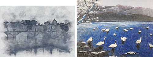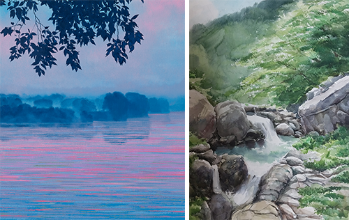 이미경 作_우포늪이야기- 不二_45.5x53cm_oil on canvas_2023 (좌) 이순이 作_여름계곡_53x40cm_수채_2023 (우)