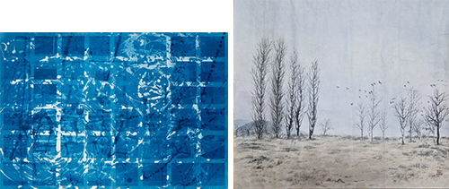 이원희 作_blue dorps - 버려진 화장실 04_54.2x79cm_2022 (좌) 이은희 作_풍경2_43x47cm_한지에 수묵담채_2023 (우)