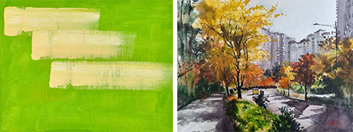 이재윤 作_빛과 마음의 소리_41x31.8cm_mixed on media_2023 (좌) 이정호 作_우면동 가을_45x53cm_수채_2021 (우)