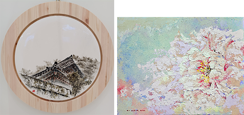 인석헌 作_수덕사_지름30cm_도자기핸드페인팅_2023 (좌) 임이랑 作_Emotion-Bloom_53x41cm_Mixed Media_2023 (우)