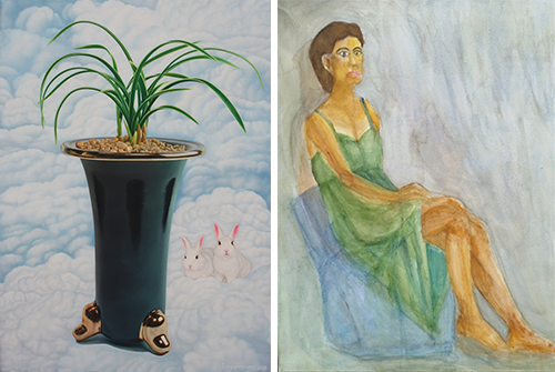 오영희 作_유년의 추억_Watercolor on arche_53x45.5cm_2023 (좌) 윤수정 作_위로_120cm_Oil on canvas (우)