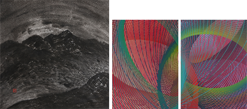 정현희 作_피안(彼岸)2023-1_40x40cm_한지에 수묵_2023 (좌) 조성훈 作_Thread-Channel28_72.7x53.0cm, Each_Acrylic on Canvas_2023 (우)