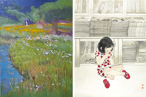 김은숙 作_신비_60x60cm_Oil on Canvas_2023 (좌) 김정란 作_꿈을 키우는 아이_145.5x112.1cm_비단에 채색_2023 (우)