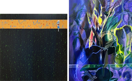 심지훈 作_무제_45.0x45.0cm_acrylic, collage on canvas_2023 (좌) 양윤선 作_표상의 틈, 2023_Oil on canvas_45.5x53cm_2023 (우)