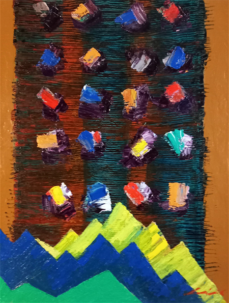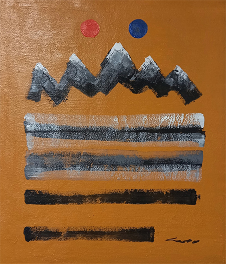 궁, 해와 달 그 장르의 일환으로 조선시대 궁궐 정진의 어좌 뒤편에 놓여던 일월오봉도를 해와 달은 색으로 단순화 시켜으며 나머지 부분은 선이나 면으로 음영을 주어 낮과 밤을 현대 회화로 표현 하였다.