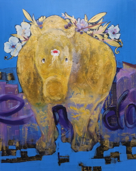 꽃, 새, 나무, 코뿔소, 구름 등 자연물의 이미지와 인공의 건물, 큰길과 도심 이미지, 아이의 천진함을 통해 문명과 자연의 대결이 아닌 균형과 상생의 이미지를 만들고 인간과 동식물, 즉 자연과의 조화를 통해 공존의 이미지를 만들었다. 또한 평면에서 오는 단조로움을 탈피하고자 입체감을 부여하고자 했다. 철가루, 나무 톱밥, 모델링 페이스트, 에폭시 등의 질료와 물감을 두껍게 올려 작업의 느낌과 깊이를 더하고자 하였으며 새로운 작업의 일환으로 미디어 아트화면 공간에 나만의 세계를 표현하여 꽉 찬 이야기 주머니를 풀 수 있어서 행복하다.