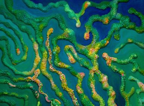 일견하면 전반적으로 초록색이 지배적이다. 거기에는 다양한 기호, 형태 그리고 색채가 어우러져 있다. 작가 박진영의 작품은 어느 하나도 자극적이거나 스펙터클한 강조점 없이 무난한 화면을 구성한다. 시각적 피로감을 주지 않는 그림들은 화면 안 변화무쌍과 운동감이 신비한 이야기체로 표현한다. 어떤 것은 전면회화(全面繪畵, All Over Painting)처럼 배경과 내용의 구분이 없는 추상성이, 어떤 것은 구체적인 기호들이 운집해 있다. 또 다른 것은 원근을 허락하지 않는 산과 바다 풍경이, 아니면 기하학적 도형, 현미경 속 풍경과 같은 화면을 만든다. 이런 다종의 기호들과 다양한 서사, 물감의 얼룩과 추상성은 과연 무엇을 말하는 것일까?