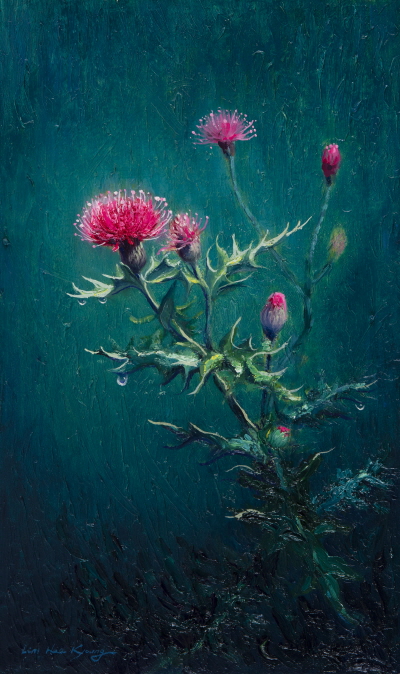 삶의 무게에 짓눌려 힘겨운 일상을 지내고 있을 때, 길가에 핀 손톱만한 들꽃이 내 자신처럼 애처롭게 다가왔다. 어느 날, 새벽 이슬 머금은 닭의장풀을 자세히 들여다보니, 연보라색 꽃잎이 보석 박힌 실크처럼 빛나고 있었다. 겨우 반나절을 폈다 지는 닭의장풀도 자신에게 주어진 시간을 최선으로 찬란하게 살고 있었다. 우주의 시간으로 보면 우리의 삶은 닭의장풀의 반나절보다도 짧다. 그때 한바탕 꿈과 같은 삶을 들꽃처럼 감사한 마음으로 살아야겠다는 생각이 들었다. 작지만 큰 울림을 준 꽃들에게 감사하며, 그런 마음을 들꽃 연작에 정성스레 담았다.