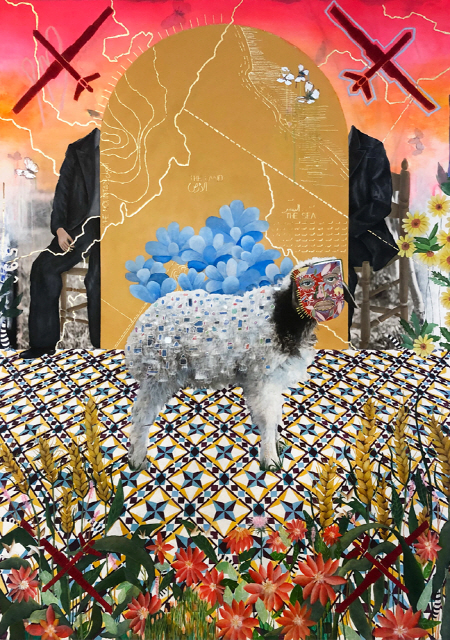 Dana Barqawi 作_Distorted_Oil, Acrylic, Thread, Gold leaf on Canvas_107x142cm_2021