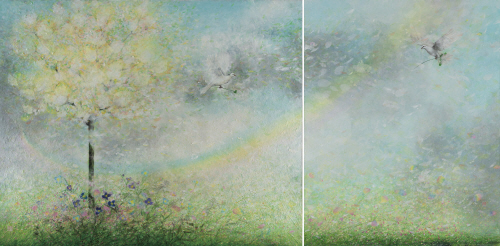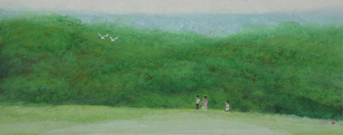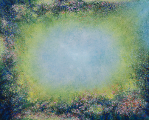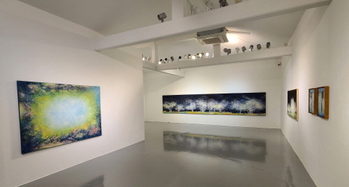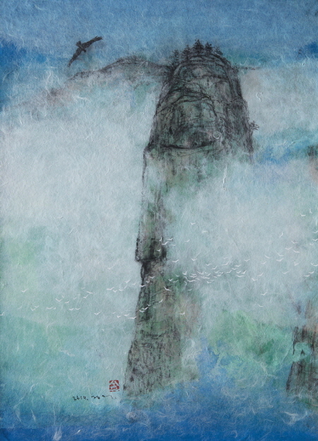 이에 더하여 대단히 얇은 한지를 이용한 독특한 화면의 구축은 주목되는 부분이다. 작은 숨결에도 쉽게 반응하는 민감하기 짝이 없는 한지를 숨죽여 중첩함으로써 구축되는 오묘한 깊이의 심미는 매우 흥미롭다. 이는 단지 한지라는 물성의 발휘에 그치는 것이 아니라 작가의 작업 전반을 관류하고 있는 몽환적이며 안온한 분위기를 조화롭게 수용해내는 기능을 수행한다. 적어도 작가에게 있어서 이러한 한지의 운용은 이질적인 재료, 혹은 표현 방법이라는 단편적인 의미가 아니라 자신의 작업 전반을 개괄하고 설명할 수 있는 상징적인 표현인 것이다. 작가의 작업은 분명 강렬한 종교적 색채를 지니고 있지만, 함축과 은유의 효과적인 표현과 색채와 한지 등을 이용한 개별화된 방식을 통해 조형적으로 승화하여 표출하고 있다. 작가의 작업을 마주하는 이들이 별반 거부감없이 그의 화면에 몰입하고 그 안온한 조화로움에 동의하며 공감할 수 있음은 바로 이러한 이유이다. 작가의 작업은 분명 종교적 이상을 담고 있는 동시에 일반적인 채색화와는 구분되는 빼어난 채색의 심미를 보여주고 있다. 이는 작가의 작업이 특정한 내용으로 규정되거나 평가되서는 안될 것임을 말하는 것이다. 무엇보다 중요한 것은 작가가 화면을 통해 드러내고 있는 맑고 담백하며 안온하고 조화로운 이상 세계의 모습이다. 어쩌면 이는 현실을 살아가는 모든 이들에게 필요한 위로와 안식, 그리고 축복의 메시지이기 때문이다.