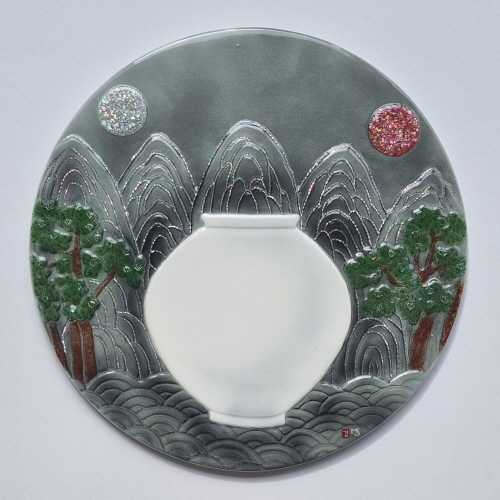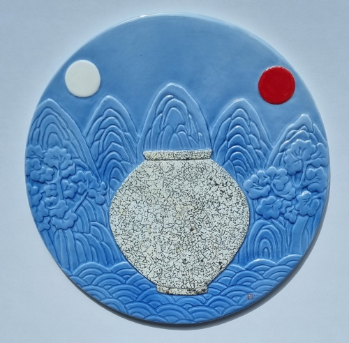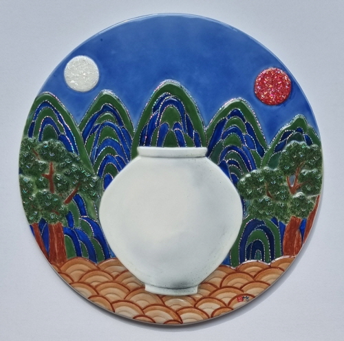 달항아리와 일월오봉도2_30cm_Painting on ceramic, 1250℃, 800℃, 자개_2023