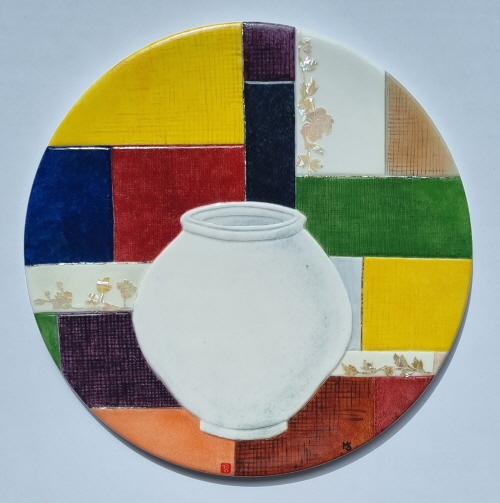 달항아리와 조각보_32cm_Painting on ceramic, 1250℃, 800℃, 자개_2023