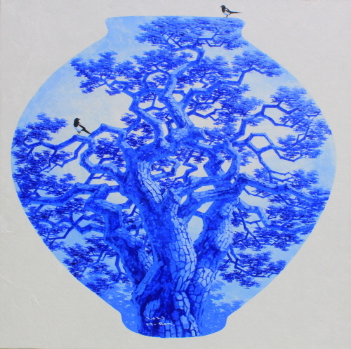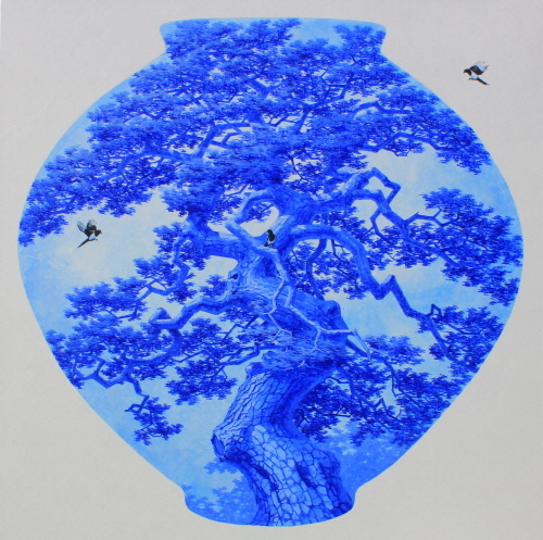 회화의 기본구조는 전경과 후경이며 조형은 선과 면에서부터 출발한다. 그는 소나무와 달 항아리의 이미지를 오버랩의 기법을 통하여 회화의 기본 구조인 전경과 후경을 어떻게 해석하고 있으며, 선과 면의 조형미를 어떻게 표현하고 있는가? 소나무는 전경이고 달 항아리는 후경이다. 소나무 형상은 주로 선이다. 여기에 보이는 다양한 선의 연속성은 개방된 동적인 이미지의 확장성을 보여준다. 달 항아리는 면이다. 사물의 체형을 암시하는 면에는 공간을 구분하고 분리시켜, 제한적이고 폐쇄된 정적인 이미지의 한정성이 담겨있다. 전경에 사실적으로 묘사된 굵은 나무둥치와 이리저리 뻗는 줄기는 다양한 선이 생명의 기운으로 성장하는 현재진행형의 살아 숨 쉬는 공간이다. 후경에 포치된 달 항아리는 구체적인 실상이 없는 허상이다. 허상은 기억 속에 정지된 상태로 남아있어 회상과 유추에 의해 되살아나는 과거완료형의 정신적 공간이다. 다시 말하면 전경의 소나무는 생명이 넘치는 생태학적 환경의 신비감을 보여주는 영역이고, 후경의 달 항아리는 인간이 남긴 물질적 문화유산의 정신과 전통의 유구함을 제시하는 상자이다. 그는 실상(소나무)과 허상(항아리)을 눈에 보이는 현상계와 보이지 않는 정신세계의 상반된 구조로 대비시켜 ‘중첩의 미학’의 시각적 효과를 이야기하고 있다.