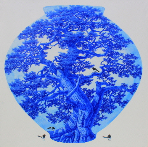 최근 그는 소나무와 달 항아리의 이미지를 접목시키는 작품을 하고 있다. 달 항아리는 하얀 바탕색과 둥근 형태가 보름달 같다. 그리고 한국인 정서와 미적 감수성이가 가장 잘 표현된 도자기 중의 하나이다. 영원과 무한을 상징하는 완벽한 원은 아니지만 모자란 듯 부족하지도 않고 넘치는 듯 과하지도 않고 풍요하고 여유가 있지만 절제의 아름다움도 있다. 한마디로 순백하고 간결하다. 그래서 우리 민족 고유의 ‘한과 삶'의 정서가 느껴진다. 그의 최근작에 보이는 두드러진 특징은 달 항아리와 소나무 이미지 오버랩하여 화면의 공간을 구성하고 있다는 점이다. 이 오버랩기법은 영화나 음악에서 흔히 등장하는 기법이지만 현대회화에서 재료나 소재, 이미지의 다양성을 표현하고 가변적 확장의 가능성을 실험하기 위해 많은 작가들이 이 기법을 차용하고 있다. 회화의 오버랩은 이미지를 중첩이다. 두 개 이상의 이미지가 겹치는 ‘이미지의 교집합’이다. 중첩된 효과는 시각적으로 어떤 이미지를 억제하기도하고 확장하기도하여, 전혀 새로운 방향성을 제시하거나 암시하기도 한다. 그리고 중첩의 효과는 의도적으로 시공간에 대한 시지각적 사유와 이미지의 주종관계를 재구성 한다. 그리고 시간과 공간의 연속성과 불연속성을 동시에 보여준다. 중첩에는 비움이 채움이 되고 부분이 전체이고 전체가 부분인 색불이공 공즉시색의 이치를 엿볼 수 있다.