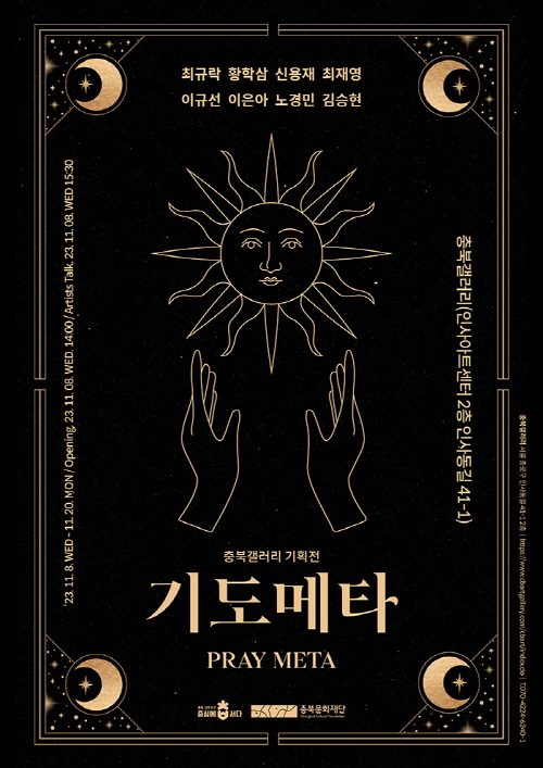 충청북도(도지시 김영환)와 충북문화재단(대표이사 김갑수)은 충북갤러리(인사아트센터 2층)에서 오는 11월 8일(수)부터 11월 20(월)까지 ‘충북청년작가 - 기도메타’ 전시를 개최한다고 밝혔다.