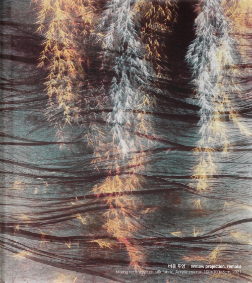 버들 투영 - Willow projection, remake_ Mixing technique on silk fabric, Acrylic mirror_100x100x8cm_2021