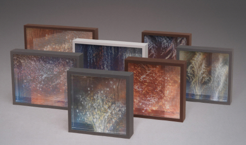 투영 작품들 23 - Projected works 23_Mixing technique on chiffon cloth, Acrylic mirror_ 30x30x8cm 4pieces, 40x30x8cm, 45x30x8cm, 50x30x8cm_2023