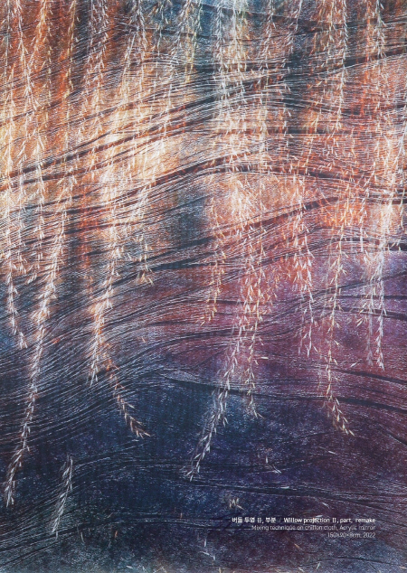 계절의 변화에 따른 자연의 서정적 Image를 은유적으로 재해석한 버들 투영(willow projection)은 현대섬유예술의 표현기법 중 하나인 열 전사염을 기본으로 제작된 섬유 작업들이다. 기본적인 평면작업과 반 입체적 부드러운 섬유 부조의 슬러시(slash) 작업에 이어, 최근에 제작된 투영 작업(projective work)은 기존의 아날로그 제작기법과 디지털과정을 넘나들며 얻어진 이미지들을 부드럽고 투명한 섬유(Silk & chiffon) 질감을 이용하여 겹쳐 보이는 형상의 실루엣(silhouette)을 연출하였으며 배경의 아크릴 밀러(Acrylic mirror)를 통한 투영 효과의 극대화로 보는 이들의 시점에 따라 다른 모습이 연출되는 홀로그램(hologram) 현상을 만날 수 있다. 이는 현대 섬유예술의 표현기법을 기본으로 작품 제작에 충실을 기하되 기법의 한계에 머무르지 않은 다양한 재료와 여러 가지 회화적 표현기법을 접목한 작업의 결과물에서 같은 이미지라도 전혀 다른 느낌이 전달되는 것이다. 결국, 보이는 것과 보여지는 것, 실상과 허상, 그 경계를 허무는 다중적이고 다층적인 현실에서 살고있는 지금, 진정한 현실, 참 현실이 무엇인지를 가끔은 묻게 만든다. 따라서 투영 작품 속에 비추어진 버들의 출현이야말로 흔들림은 있으나 쉬 부러지지 않은 현대인의 표상으로 끝없는 질주를 소리 없이 강요당하며 시간에 쫓기고 일상에 지친 현대인의 모습으로 연출하였으며 내 안의 또 다른 나를 투영하고 반추하는 과정을 통하여 존재에 대한, 무분별한 욕망에 대한, 그 치명적인 유혹에 대한, 잠시 멈춤의 숨 고르기를 통한 삶에 여유와 치유를 전하는 현대 섬유예 작품이다.