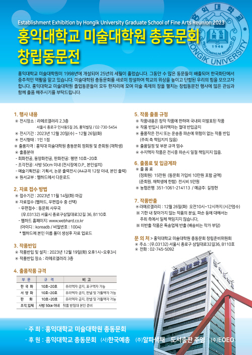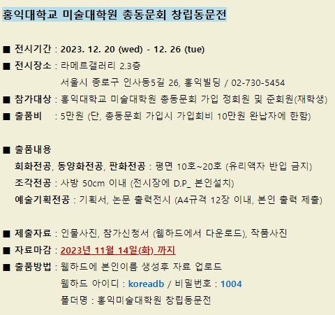 * 전시메일에 등록된 모든 이미지와 글은 작가와 필자에게 저작권이 있습니다. * vol.20231114-홍익대학교 미술대학원 총동문회 창립동문전 |